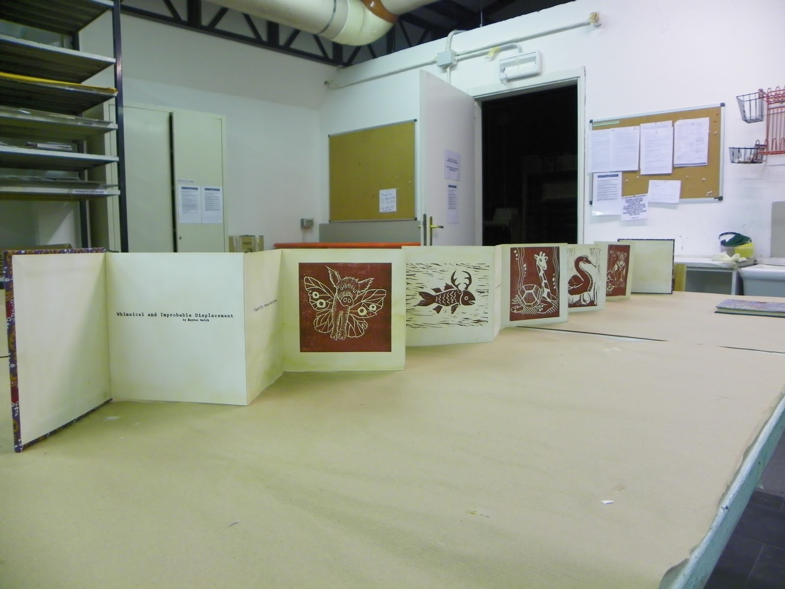 Accordion Books - 5 editions (finally assembled!). Linoleum cut/prints. Handmade book cloth, paste paper and stained paper. Xerox transfer text.